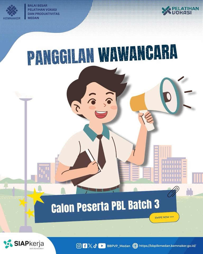 Panggilan Wawancara untuk Calon Peserta Project Based Learning Batch III 🤩 Informasi Wawancara• Hari dan Tanggal : Selasa, 07 Oktober 2025• Waktu : 09.00 WIB s/d selesai• Tempat : Gedung Serbaguna BBPVP Medan• Pakaian : Kemeja Putih, Celana/Rok Hitam serta…
