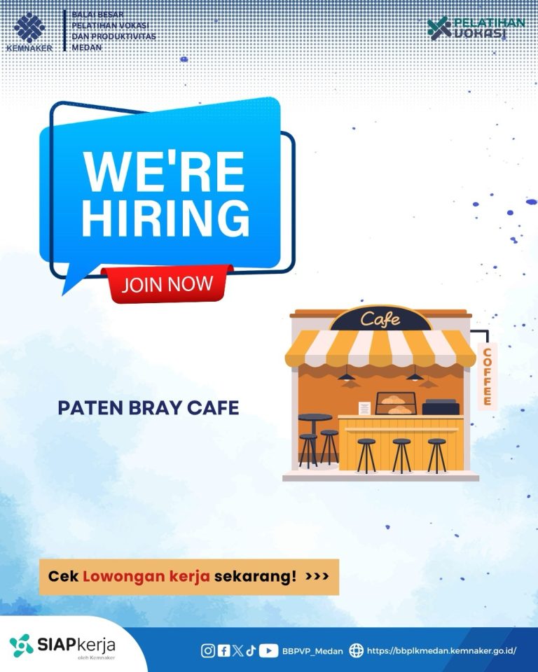 [LOWONGAN KERJA] PATEN BRAY CAFE IS HIRING FOR :• WAITERS (PENUH WAKTU) KUALIFIKASI :• Laki-Laki/Perempuan• 18-30 Tahun• Berpengalaman / Tidak Berpengalaman• Jujur dan Dapat Dipercaya• Penampilan Menarik dan Sopan Kirim CV dan surat lamaran ke:📍 PATEN BRAY CAFEKOMP. PRSU JL.…