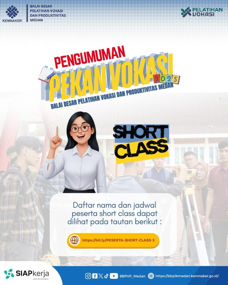 PEKAN VOKASI BBPVP MEDAN 2025📅 Tanggal: 18-19 Oktober 2025📍 Lokasi: Balai Besar Pelatihan Vokasi dan Produktivitas (BBPVP) Medan BBPVP Medan kembali menghadirkan Pekan Vokasi 2025 sebagai bagian dari upaya mendekatkan dunia pelatihan vokasi kepada masyarakat umum, industri, serta generasi muda…