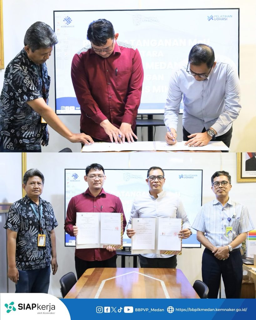 “Kerja sama ini menjadi langkah penting dalam memperkuat sinergi dunia pendidikan dengan dunia pelatihan vokasi, sehingga dapat melahirkan lulusan yang siap menghadapi tantangan industri,” ungkap Kepala BBPVP Medan, Bapak Faried Abdurrahman Nur Yuliono.