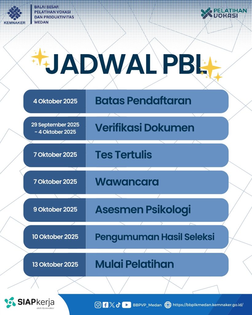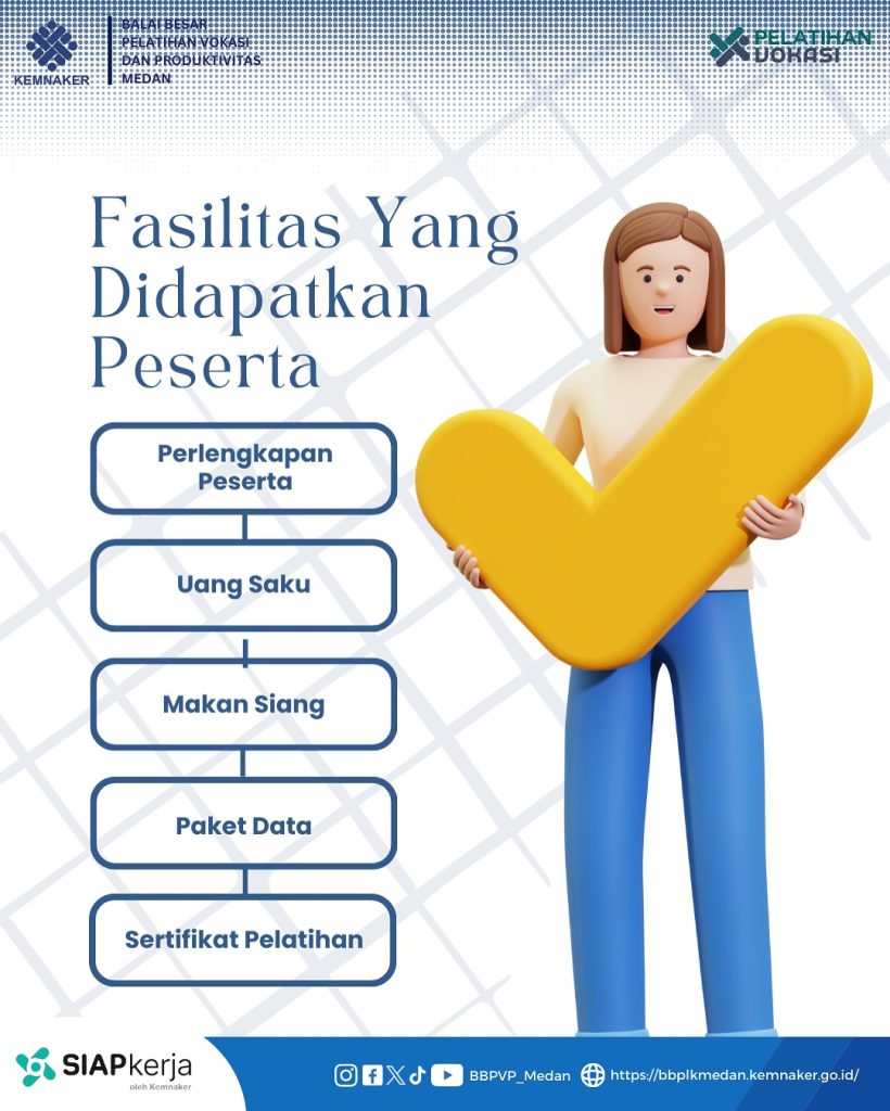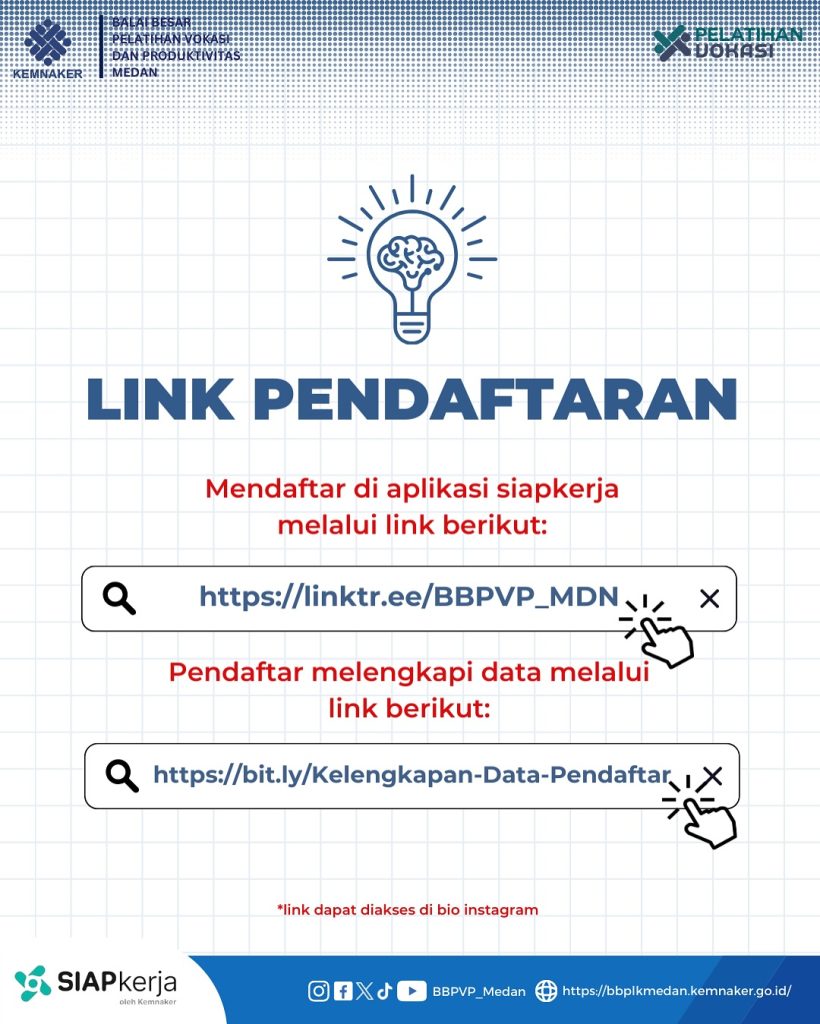 – WAJIB mendaftar melalui Aplikasi SIAPKerja melalui Link : https://linktr.ee/BBPVP_MDN