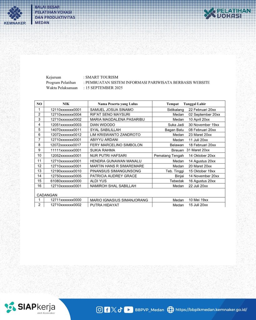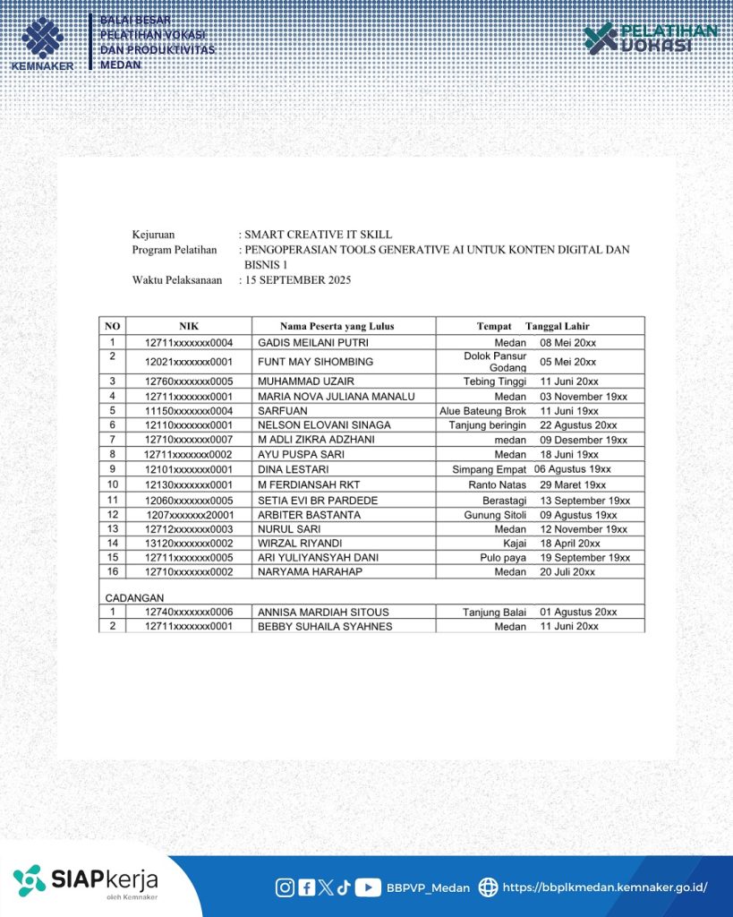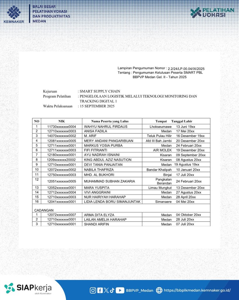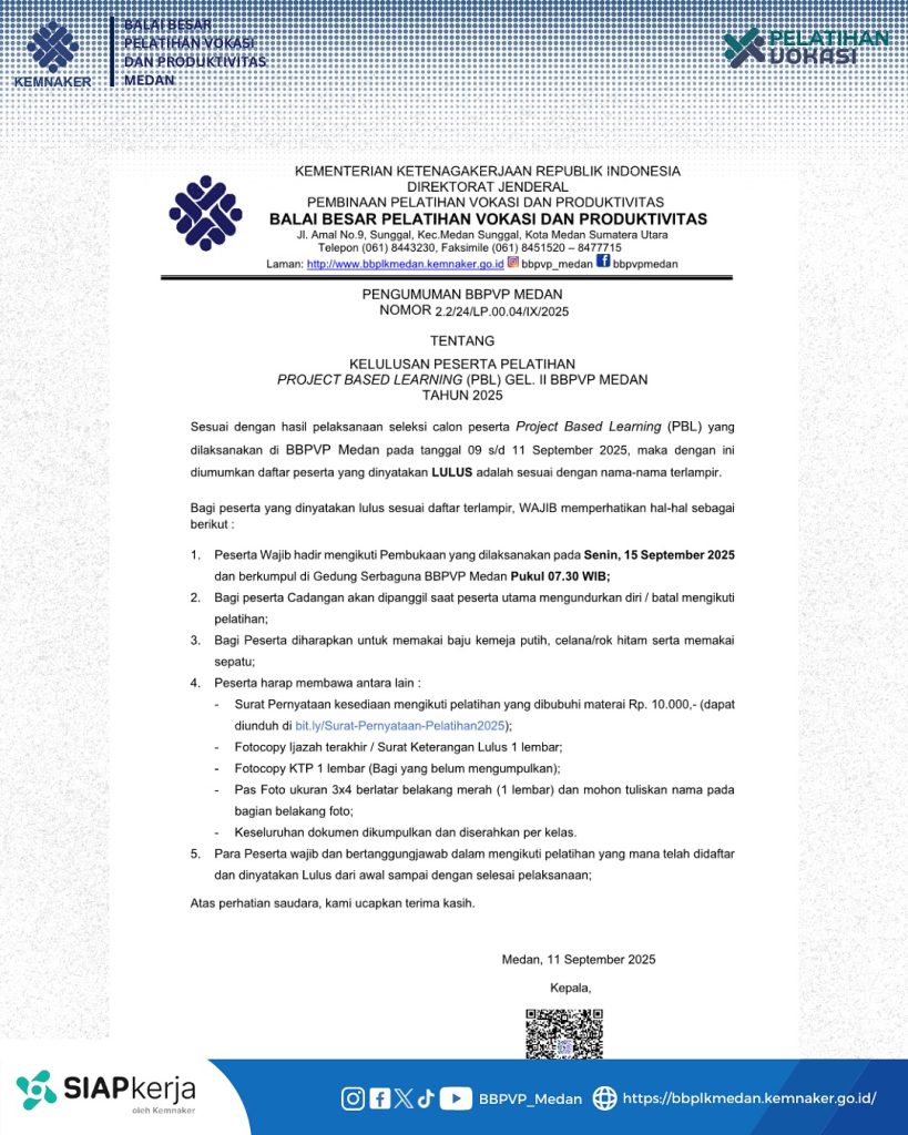 Pengumuman Kelulusan Peserta Pelatihan Project Based Learning (PBL) BBPVP MEDAN Tahun 2025