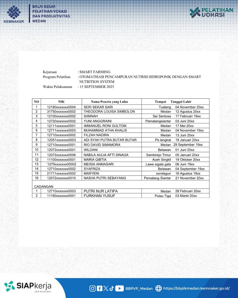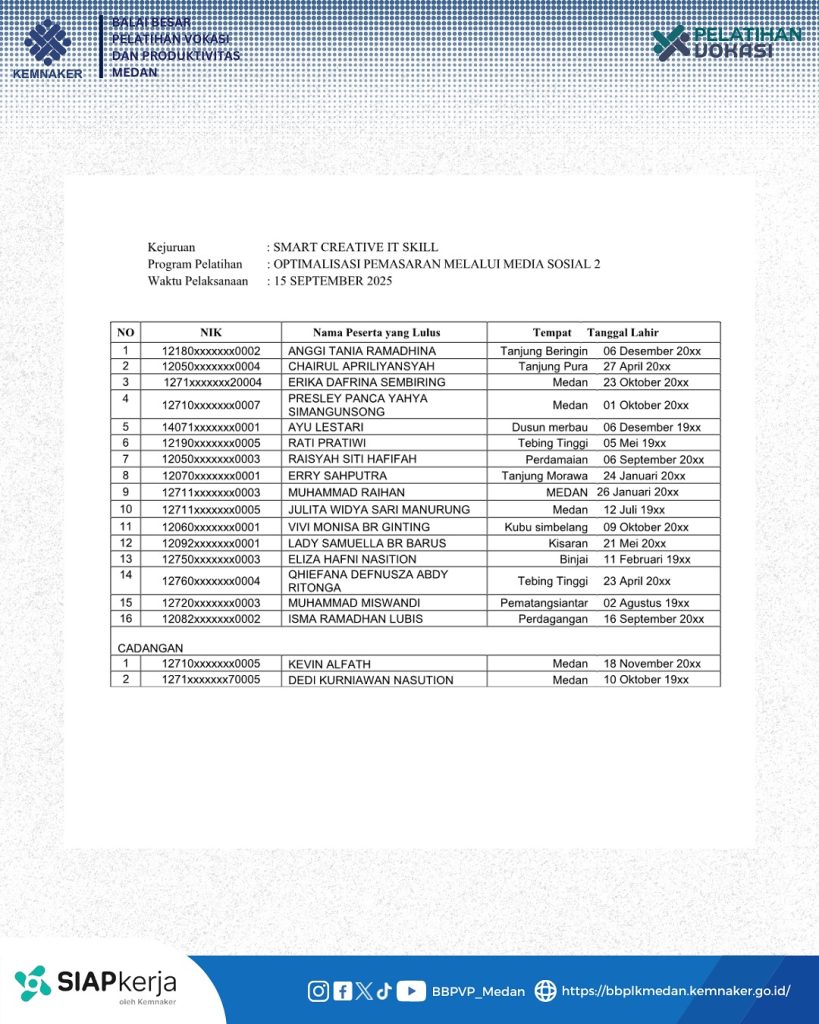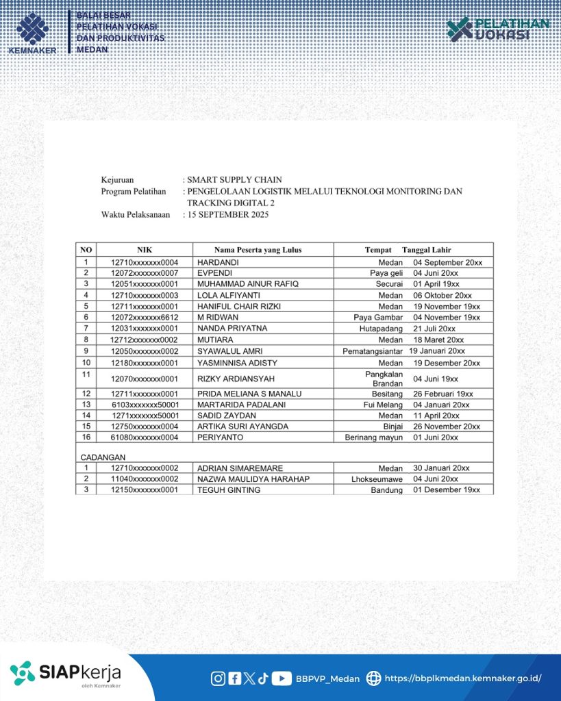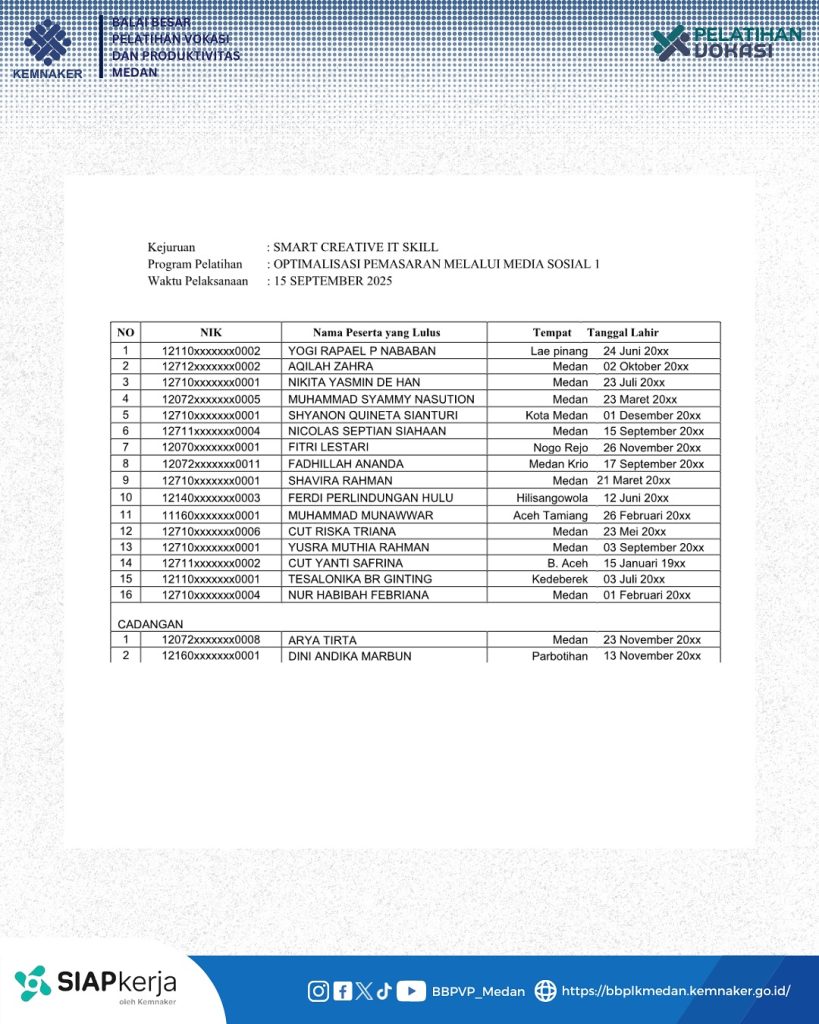 Pengumuman Kelulusan Peserta Pelatihan Project Based Learning (PBL) BBPVP MEDAN Tahun 2025