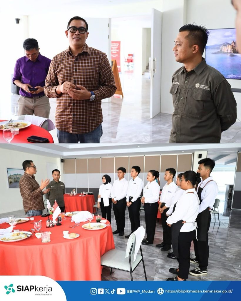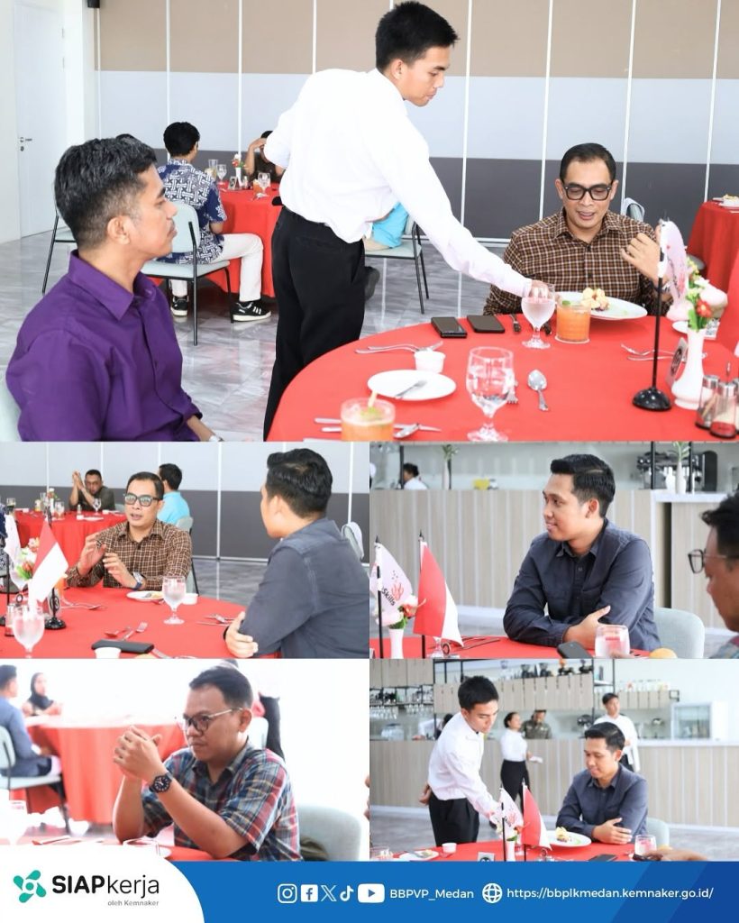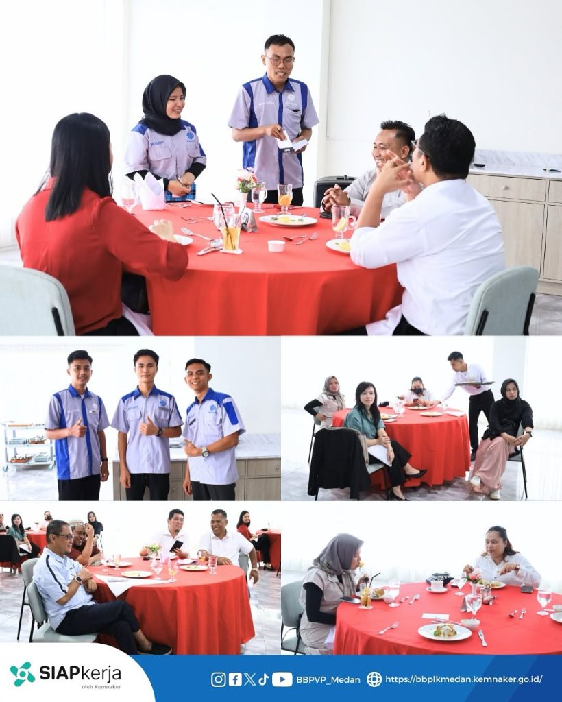 Untuk mengasah kompetensi peserta secara langsung di dunia kerja nyata, BBPVP Medan menyelenggarakan kegiatan Join Practice bagi peserta pelatihan Restaurant Management. Kegiatan ini berlangsung di area praktik restoran BBPVP Medan dan dihadiri secara langsung oleh Kepala BBPVP Medan beserta jajaran, serta tamu undangan dari dunia industri.