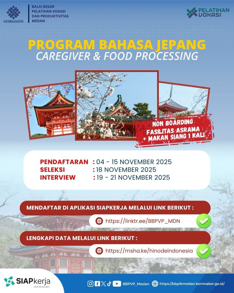 Balai Besar Pelatihan Vokasi dan Produktivitas (BBPVP) Medan – KEMNAKER membuka pendaftaran PROGRAM BAHASA JEPANG untuk bidang :